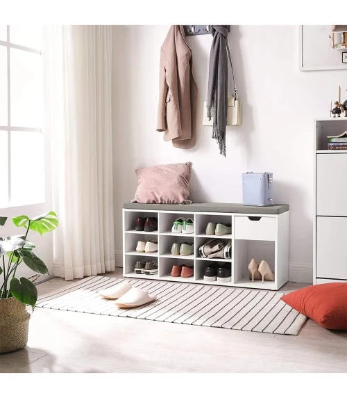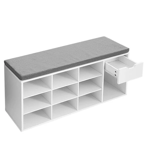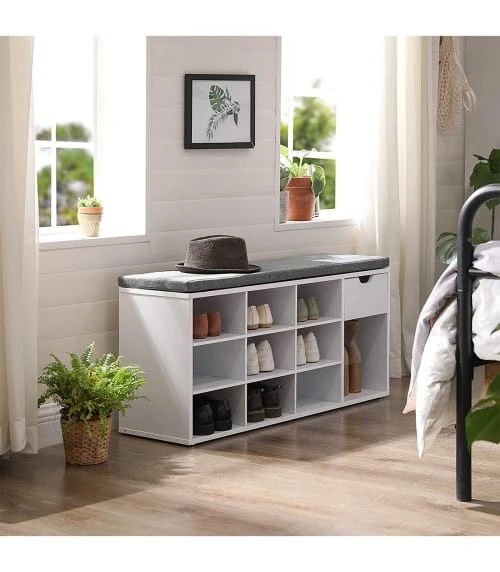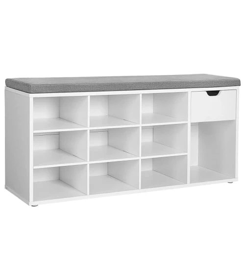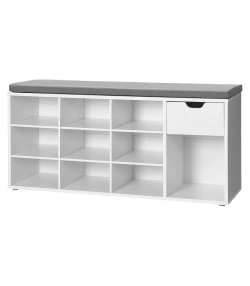 Vous êtes à la recherche d’une solution de rangement pour votre entrée ? Découvrez notre Banc à chaussures blanc avec 1 tiroir et 10 cases ouvertes – L104 cm . Alliant praticité et confort, ce banc à chaussures vous permettra de vous asseoir grâce à son assise rembourrée et vous pourrez également ranger de nombreuses paires de chaussures. Caractéristiques produit : Matière principale: MDF. Livré en kit. Notice fournie. A monter soi-même. Compartiments ouverts. Assise rembourrée. Dimension produit : Longueur 104 cm x Profondeur 30 cm x Hauteur 48 cm – Poids net : 18,5 kg. Dimensions colis : Colis n°1 : Hauteur 38,5 cm x Largeur 117 cm x Profondeur 14,5 cm – Poids brut : 20,2 kg.