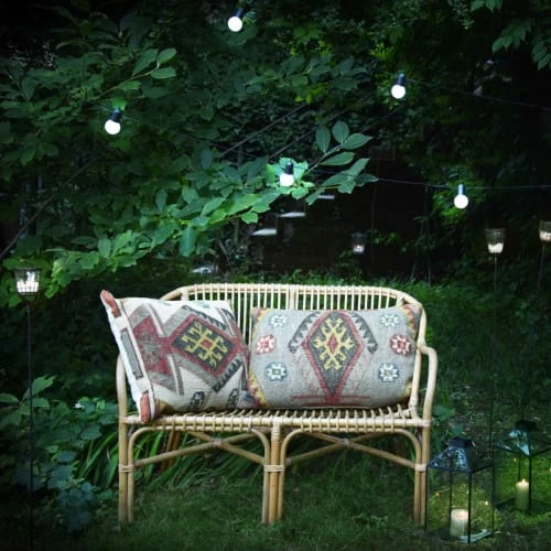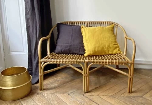 Banquette très tendance réalisée artisanalement en rotin naturel. On aime ses lignes courbes et son style bohême idéal en intérieur comme en extérieur (nous vous conseillons tout de même de la couvrir en cas d’intempéries, le rotin risque de griser). On l’agrémente volontiers de jolis coussins en coton ou lin colorés l’été et de coussins en peau de mouton l’hiver pour lui donner un look plus coc0oning. On l’aime au salon, dans la chambre des enfants ou encore sous la véranda pour un esprit jardin d’hiver.