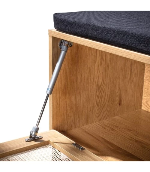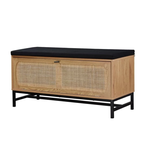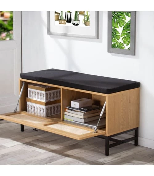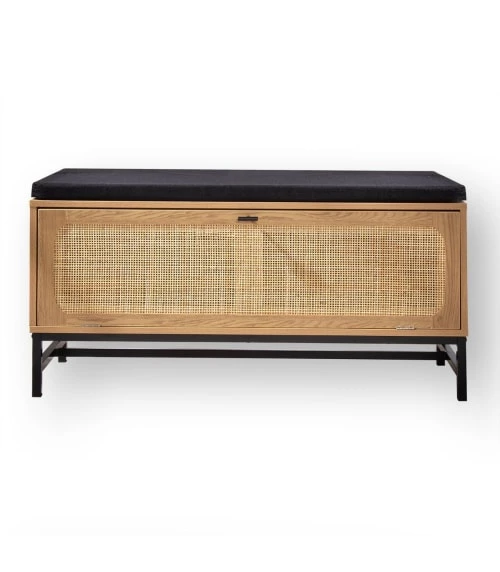 Notre Banc avec rangement chaussures et façade en rotin allie à la fois design moderne et rangement pratique ! Vous en avez assez de voir vos chaussures trainer en permanence ? Voici notre solution pour qu’elles soient ranger et cacher tout en apportant une touche de décoration à votre intérieur. Le banc vous permettra également grâce à son coussin de vous asseoir lorsque vous vous chaussez ou déchaussez. Caractéristiques produit : Banc avec rangement chaussures. 1 porte s’ouvrant avec 2 pistons plus 2 charnières. Espace rangement avec un séparateur vertical. Façade en rotin. 1 poignée métal noir. Piétement métal noir. Coussin en tissu gris sur le dessus. Matière principale: panneaux de particules recouverts décor bois. Dimensions produit : Longueur 100 cm x Largeur 38 cm x Hauteur 47 cm – Poids net : 16,5 kg. Dimensions colis : Longueur 106,5 cm x Hauteur 13,5 cm x Largeur 44 cm – Poids brut : 17,5 kg.