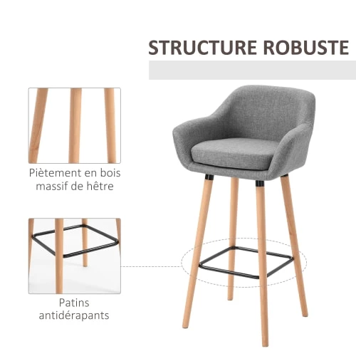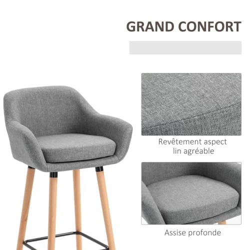 – Tabourets de bar grand confort : garnissage mousse haute densité de l’assise, dossier et accoudoirs ; revêtement lin agréable par toutes les températures ; repose-pied intégré