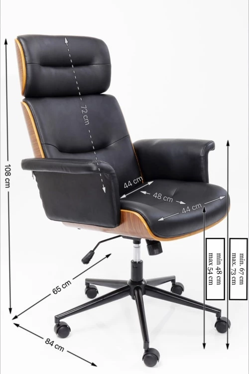Cette chaise de bureau vous offre tout le confort pour bien travailler avec son dossier haut qui comprend un repose-tête et ses accoudoirs incurvés. Son assise noire simili cuir contraste avec sa face arrière en contreplaqué. Hauteur d’assise ajustable. Livrée avec le pied à assembler. Enlevez les miettes et la poussière avec une brosse douce. Vérifiez que votre produit de nettoyage ne décolore pas la matière en l’essayant d’abord sur une zone non visible (par exemple sous l’assise). L’exposition au soleil peut décolorer votre chaise.