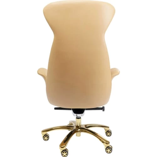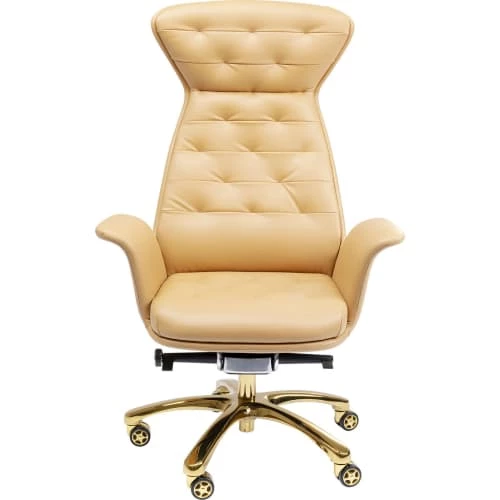 Ce fauteuil de bureau vous apporte la prestance d’un grand dirigeant avec son dossier haut avec repose-tête et son simili cuir matelassé. Les accoudoirs incurvés complètent l’esthétique vintage et élégante, le tout monté sur un piètement en acier brillant pivotant et réglable en hauteur. Disponible en marron foncé avec piètement doré et en marron clair avec piètement argenté. Capacité de charge maximale : 500 kg. Réglable en hauteur : 8 cm. Hauteur d’assise : 48 cm. Livrée avec le pied à monter. Enlevez les miettes et la poussière avec une brosse douce. Vérifiez que votre produit de nettoyage ne décolore pas la matière en l’essayant d’abord sur une zone non visible (par exemple sous l’assise). L’exposition au soleil peut décolorer votre fauteuil.