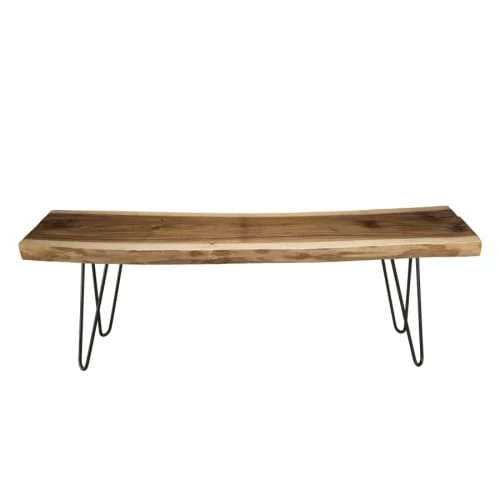 Banc nature Mungur pieds épingles scandi métal. Dimensions : 160 x 45 x 44 cm. Article en Mungur et Acier. Cet article est composé de bois de Mungur ! Ce bois exotique est utilisé à l’état brut pour fabriquer ce produit authentique. Il est donc normal qu’il présente des variations de teintes ainsi que des petites irrégularités puisqu’il s’agit de sa particularité. Installez-vous sur ce joli banc naturel en bois de Mungur et métal. Doté de pieds épingles noirs, il est tendance. Son assise est authentique et unique. Le rendu est minimaliste pour que vous puissiez l’associer à votre décoration actuelle.