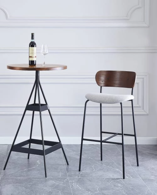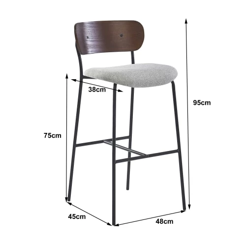 Dimensions produits = 48 x 45 x 95 cm ; Hauteur d’assise = 75 cm ; Profondeur d’assise = 38 cm ; Poids du produit = 11.5 kg ; Poids total du colis = 13 kg ; Poids maximal supporté = 120 kg ; capacité d’assise = 1 personne ; Produit à assembler = Non ; Produit empilable = Oui ; Epaisseur de mousse = 3 cm ; densité de mousse = 26 kg / mètre cube ; Poids du tissu = 390 g / mètre carre ; Certification 1 = Bois certifié durable FSC ; Certification 2 = Tissu certifié OEKO-TEX de composition saine et durable ; Finition du métal = Epoxy noir
