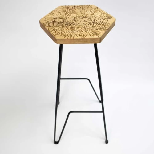 Les quatre pieds en épingle assurent une très bonne stabilité et l’acier noir mat apporte un look contemporain. L’assise hexagonale est confortable et solide, tandis que la gravure laser sublime le veinage du bois.